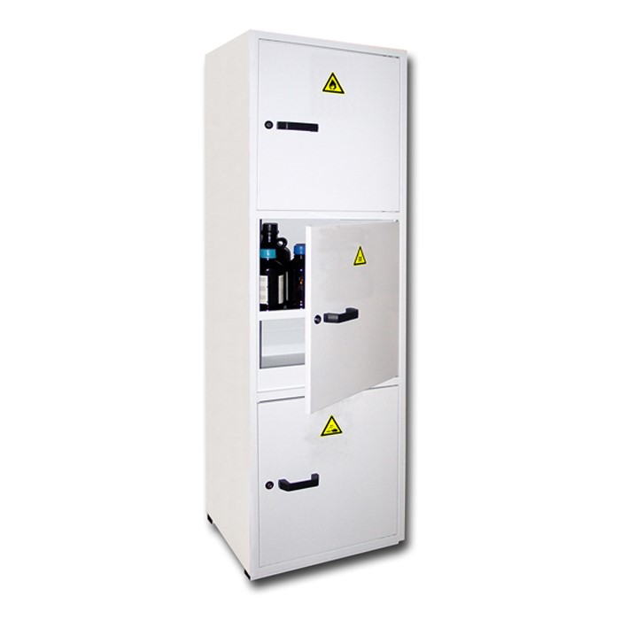 A3PCA: Armoire de sécurité multirisques, 3 portes battantes, 3 compartiments dont 1 sur-équipé PVC pour les produits corrosifs. Ht x Lg x Prof; intérieur 3 x (590 x 550 x 475); extérieur 1825 x 560 x 545, volume de stockage 90 litres, poids 93 Kg.