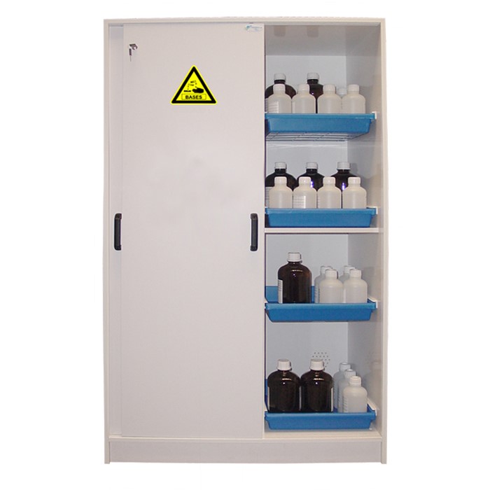 APC221 corrosifs: pour acides et bases, 2 portes coulissantes, 2 compartiments, Ht x Lg x Prof; intérieur 2 x (1760 x 465 x 530); extérieur 1850 x 1135 x 615, volume de stockage 220 litres, poids 155 Kg.