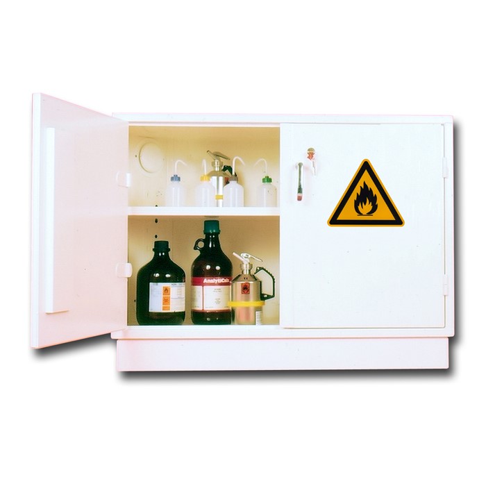 SV50: Armoire de sécurité sous-paillasse, pour stockage des produits inflammables, corrosifs ou nocifs. Ht x Lg x Prof; intérieur 650 x 950 x 400; extérieur 750 x 1000 x 450, volume de stockage 50 litres, poids 62 Kg.