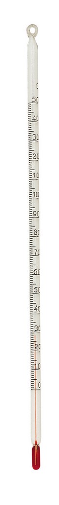 Thermomètre en verre rempli de liquide coloré, sans mercure, diamètre 6 mm, répétabilité +/- 1°c.